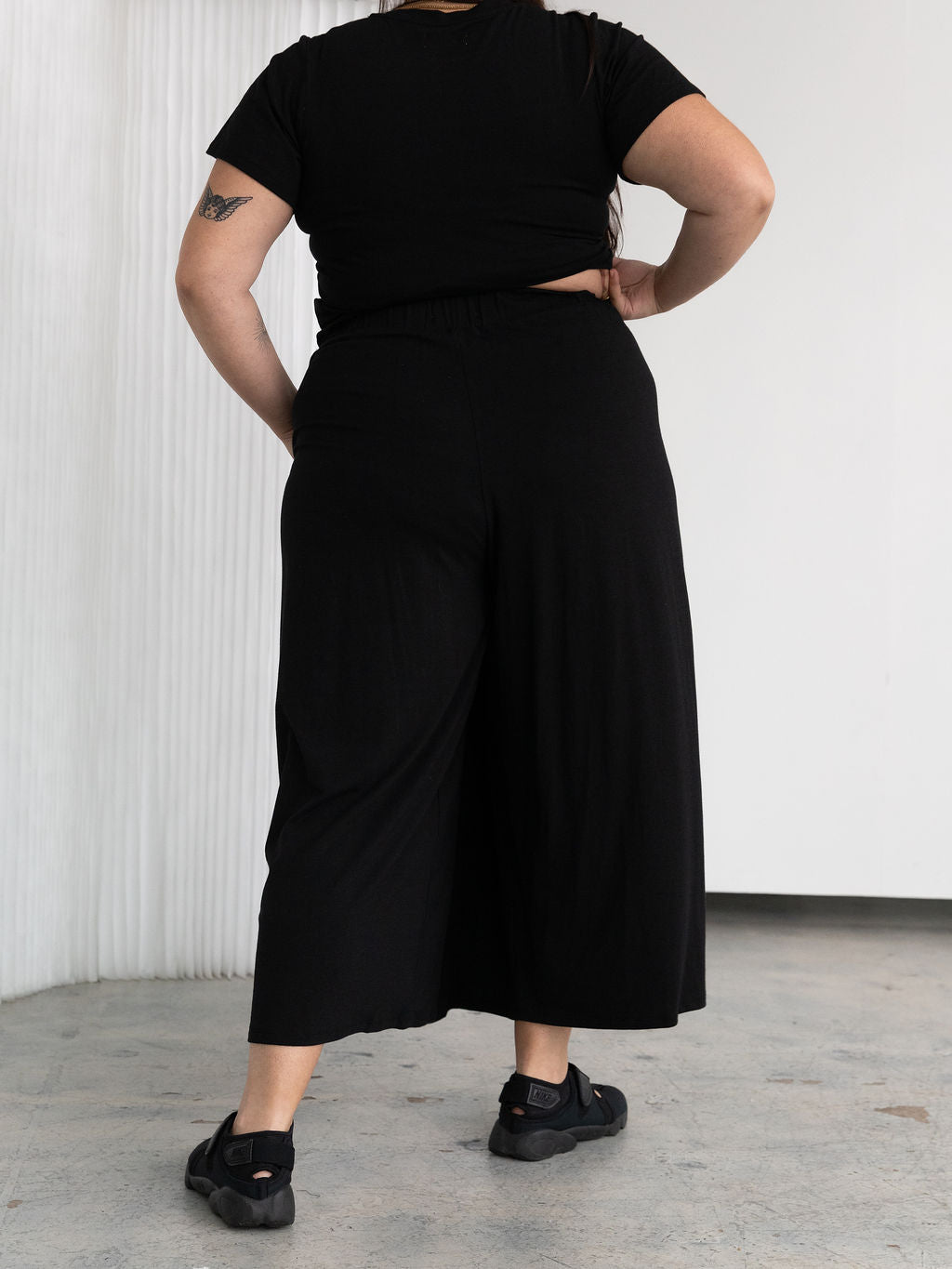 -Front is an A line wrap skirt appearance while back is a flowy crop pant