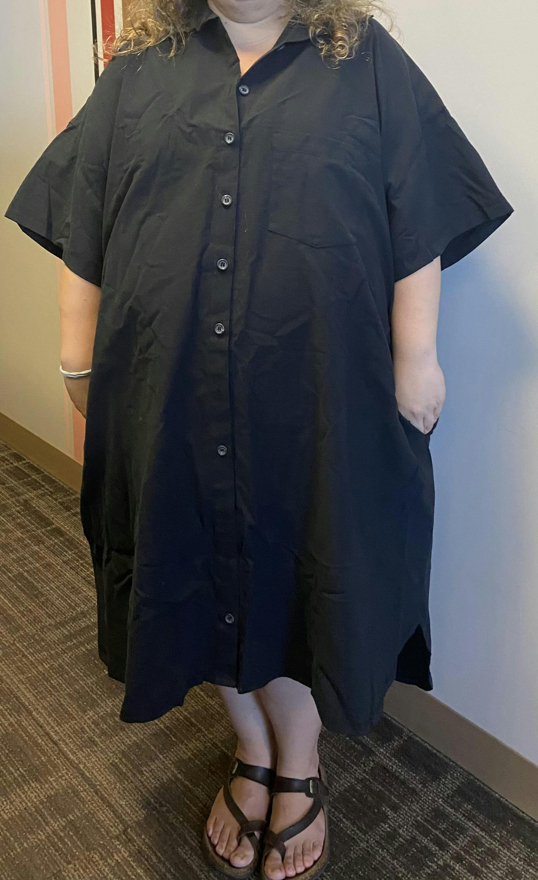 Extremely comfy dress! I straddled a 3x/4x and I went with 4x to be on the safe side of a button popping at the chest. It’s wonderful! It’s very loose and comfy / I wore it during a heat wave and it felt very comfortable. I can easily wear this out or to work. I really love the colour and feel of the fabric! I can wear shorts underneath without them showing. Would definitely recommend! I think it would look really cute for winter also with stockings and a turtle neck. And I mean!! Pockets!! The best, and they fit my phone easily and no worry of it falling out.