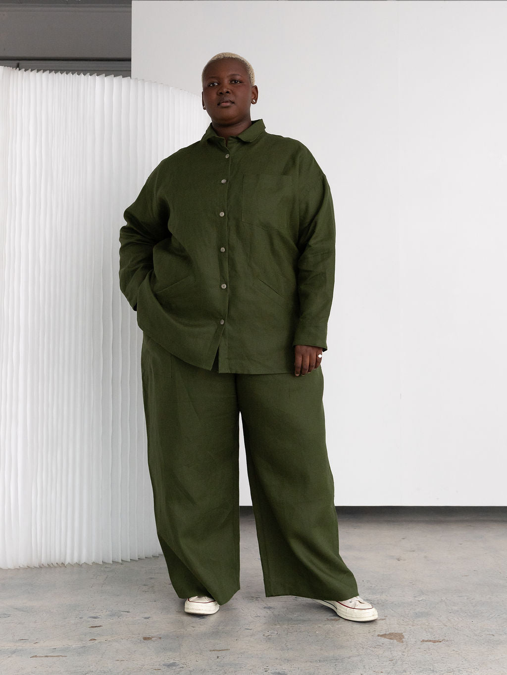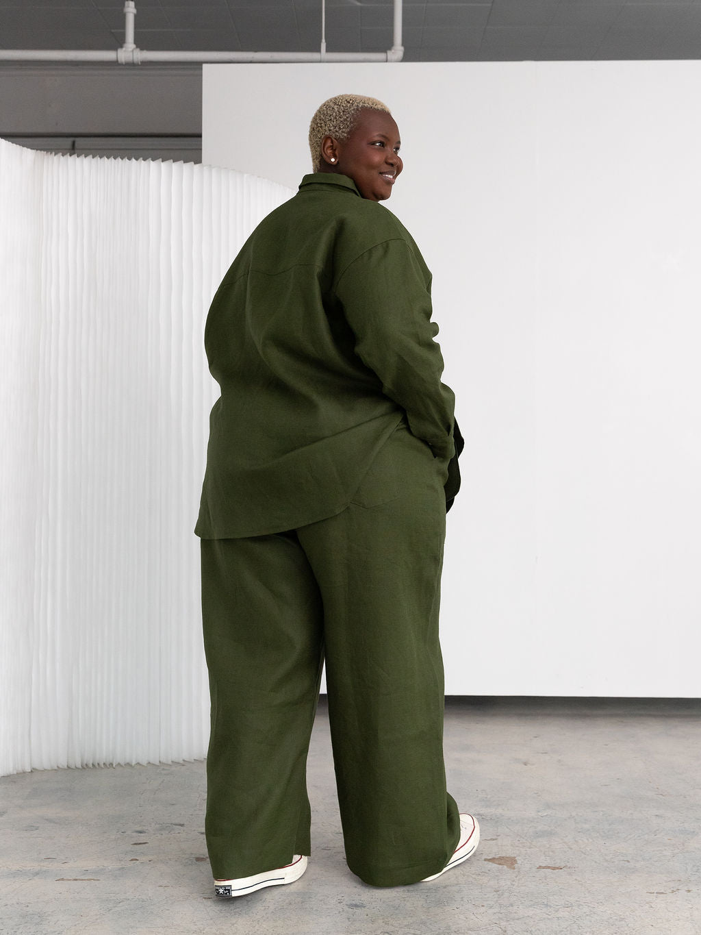 We work with an eco-certified mill in China to custom weave our 100% Flax Linen. Our linen is slightly heavier than a typical summer linen making it more resistant to pilling. It's not pre-shrunk, meaning you can create your own custom fit. Our linen is dyed using azo-free reactive dye. Its OEKO-TEX® and GOTS certified, and follows REACH standards. Its made with minimal water consumption and 65% of the water used is reused, creating a semi-circular model.